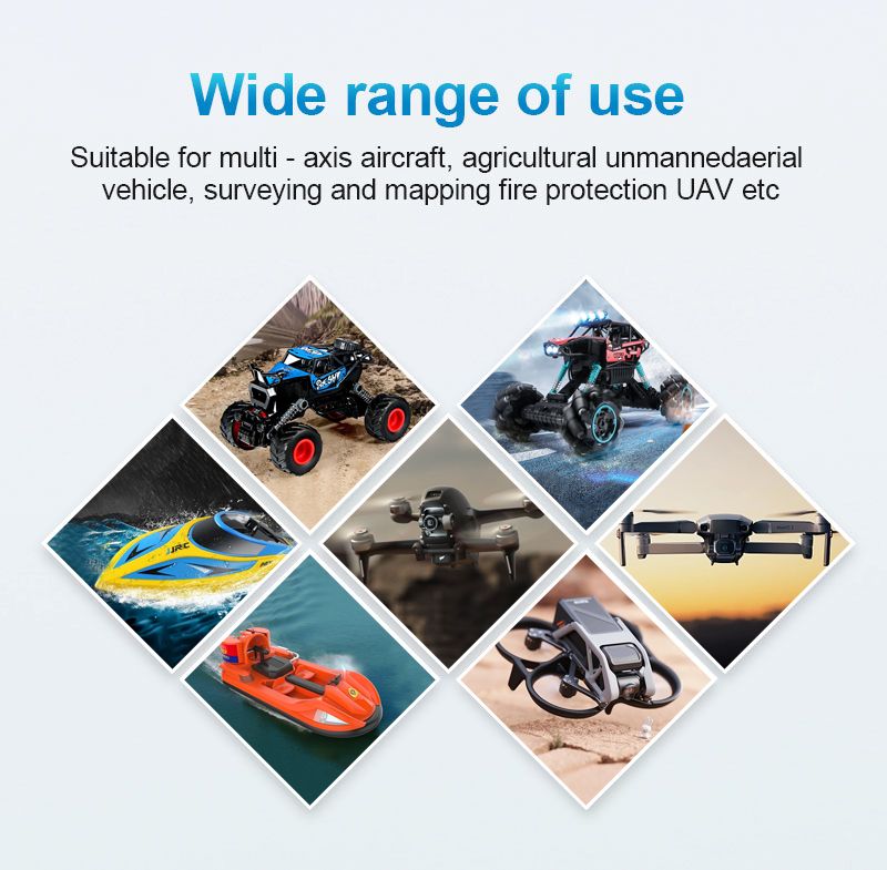 మాడ్రోన్ బ్యాటరీ ప్యాక్లువిస్తృత శ్రేణి వైమానిక మరియు భూ-ఆధారిత అనువర్తనాలకు శక్తినిచ్చేలా సూక్ష్మంగా రూపొందించబడ్డాయి. వీటిలో పంట పర్యవేక్షణ మరియు స్ప్రేయింగ్ కోసం వ్యవసాయ డ్రోన్లు, అధిక పనితీరు అవసరమయ్యే రిమోట్ కంట్రోల్ వాహనాలు మరియు వినోద లేదా వృత్తిపరమైన సెట్టింగ్లలో ఉపయోగించే వివిధ రకాల డ్రోన్లు ఉన్నాయి. అదనంగా, మా బ్యాటరీలు ఎలక్ట్రిక్ బైక్లకు బాగా సరిపోతాయి, సుదీర్ఘ ప్రయాణాలకు నమ్మదగిన శక్తిని అందిస్తాయి. వారు ఏరియల్ ఫోటోగ్రఫీ మరియు డెలివరీ వంటి వాణిజ్య డ్రోన్ సేవల డిమాండ్లను కూడా తీరుస్తారు. సైనిక మరియు రక్షణ కార్యకలాపాల కోసం, మా బ్యాటరీలు క్లిష్టమైన వాతావరణంలో మన్నిక మరియు విశ్వసనీయతను అందిస్తాయి. చివరగా, వారు వినూత్న డ్రోన్ టెక్నాలజీలపై పనిచేసే పరిశోధన మరియు అభివృద్ధి సంస్థలకు మద్దతు ఇస్తారు, పరీక్ష మరియు నమూనా కోసం అనుకూలీకరించదగిన పరిష్కారాలను అందిస్తారు.